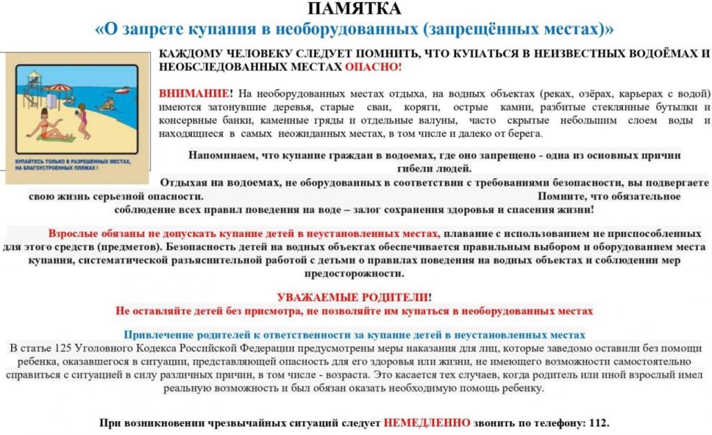 ПАМЯТКА «О запрете купания в необорудованных (запрещённых местах)»
